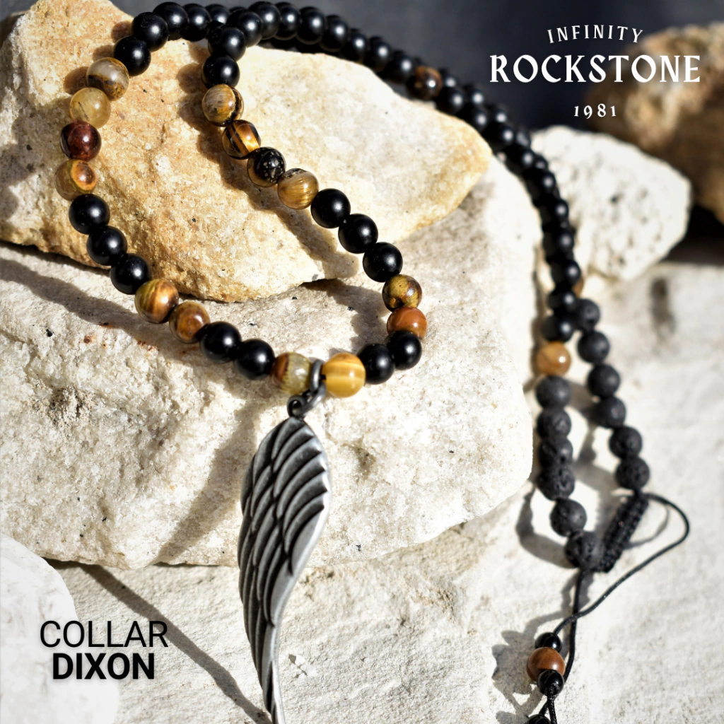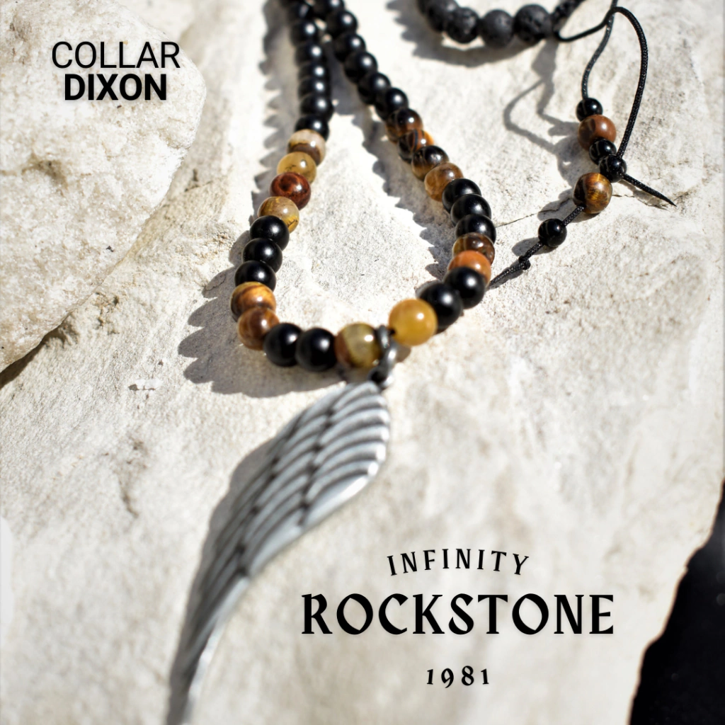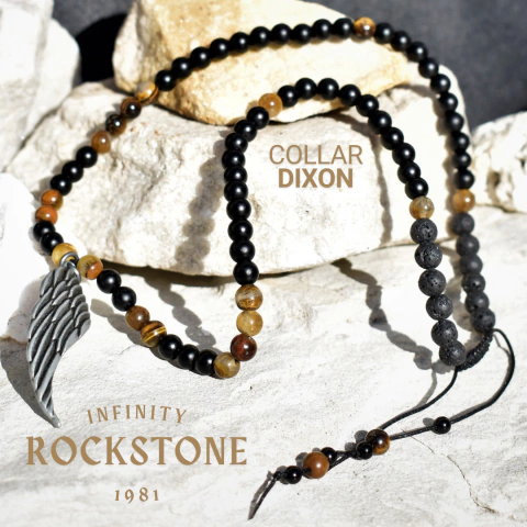 Descripción: Collar de piedras naturales hand-crafted diseñado con 86 rocas y gemas de 2, 4 y 6 mm de diámetro, elaborado en hilo negro de fibra de nylon de excelente resistencia y calidad (hilo no encerado, hilo no elástico), y cierre ajustable corredizo de macramé (Smart Closure). En el centro se halla un dije colgante de metal fundido y envejecido de forma alada.