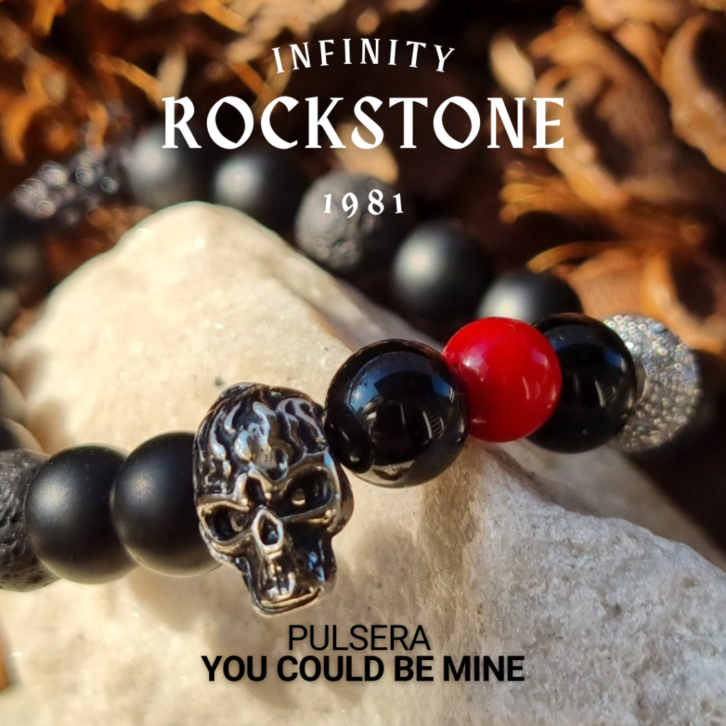 La presencia de piedras naturales como ónix negro mate y ónix negro brillante de 8 mm, unidas a al metal del glam rock representado por la esfera de acero quirúrgico de 8 mm de diámetro con micro-incrustaciones de zircón, la sangre representada a través del coral rojo de 7 mm de diámtero, la figura de un Terminator T-800 representada por un dije calavera de metal fundido macizo en el centro del brazalete acompañado por el equilibrio dotado por las rocas volcánicas de 8 mm de diámetro dan lugar a este bello accesorio de limitada edición que representa la música y la fuerza de "You could be mine", elaborada en hilo negro de fibra de nylon (hilo no encerado, hilo no elástico), y cierre ajustable corredizo de macramé (Smart Closure), o tanza elastizada Crystal Tec de 1mm.